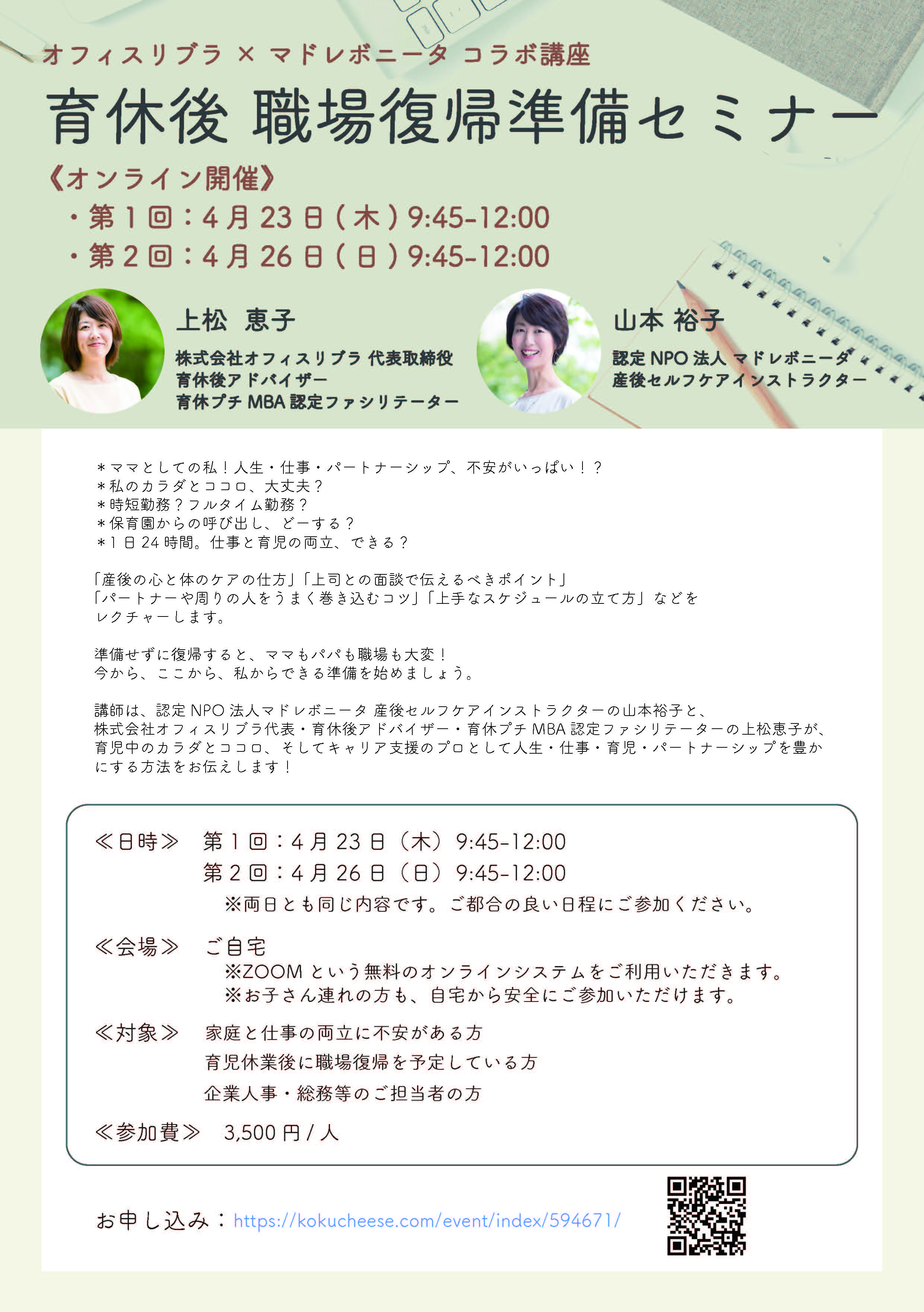 【オンライン開催】4/23(木)、4/26(日)育休後 職場復帰準備セミナーを開催します