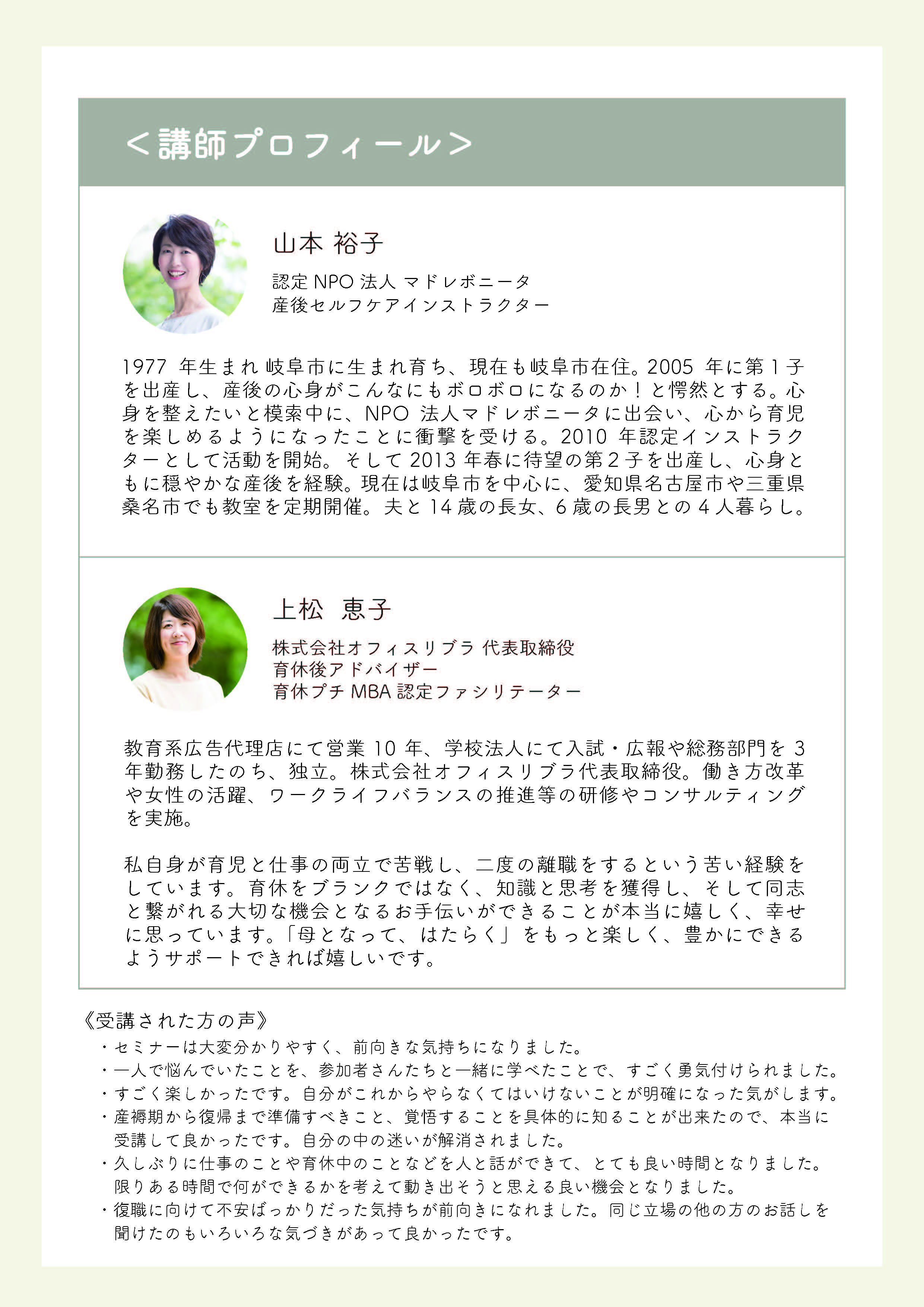 講師は、認定NPO法人マドレボニータ 産後セルフケアインストラクターの山本裕子と、株式会社オフィスリブラ代表・育休後アドバイザー・育休プチMBA認定ファシリテーターの上松恵子が、育児中のカラダとココロ、そしてキャリア支援のプロとして人生・仕事・育児・パートナーシップを豊かにする方法をお伝えします!